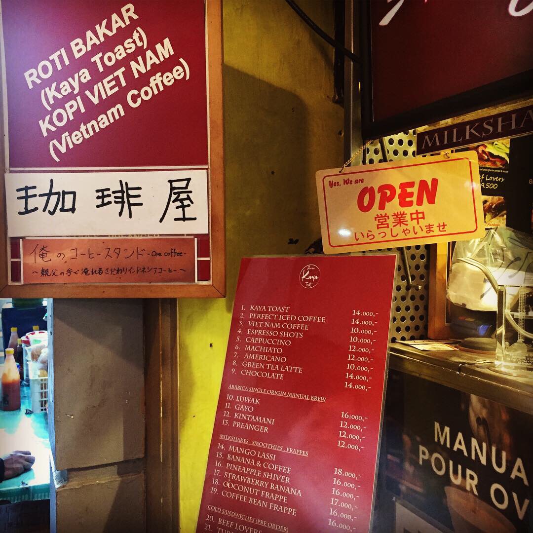 個人的におじさんのところのアイスコーヒー(豆はベトナム!)とカヤトーストが好きなので、今回もそちらで。なお、アイスコーヒーは一杯14,000ルピアなので、約115円くらいです。カヤトーストも同額です。インドネシア語か英語ができる方は、是非おじさんとお話もお楽しみください。元々はエネルギー関連の仕事で、掘削を行うプロジェクトのマネージャーをされていたそうです(すごい…!)。そのほかコーヒー豆を100gあたり100円~買えるお店も付近にありますので、お土産買いにももってこいです。