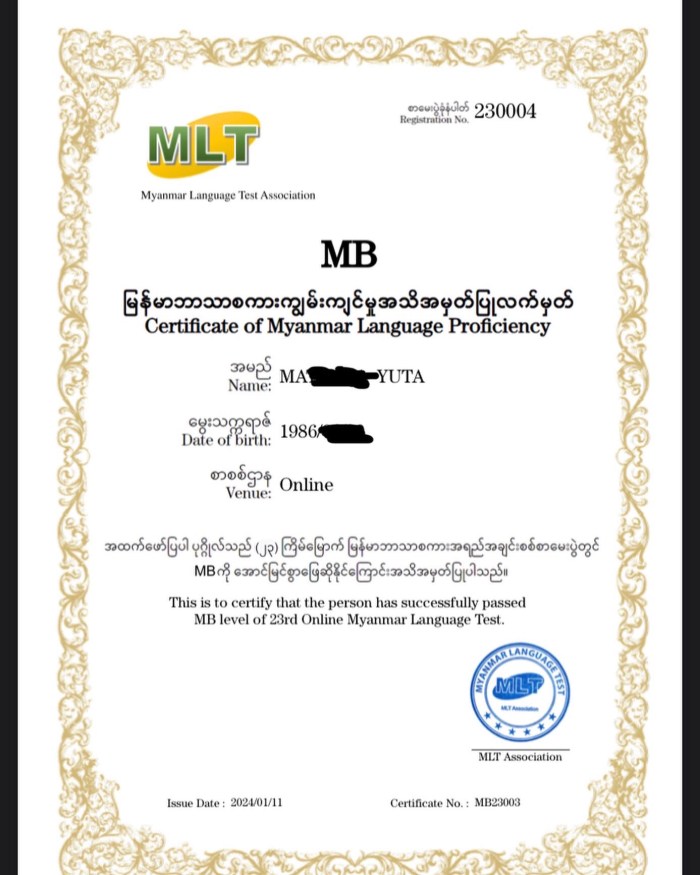 去年の年末に受験したミャンマー語検定MBレベルの結果が今月来ていたのですが、仕事ですっかり更新できていませんでした…