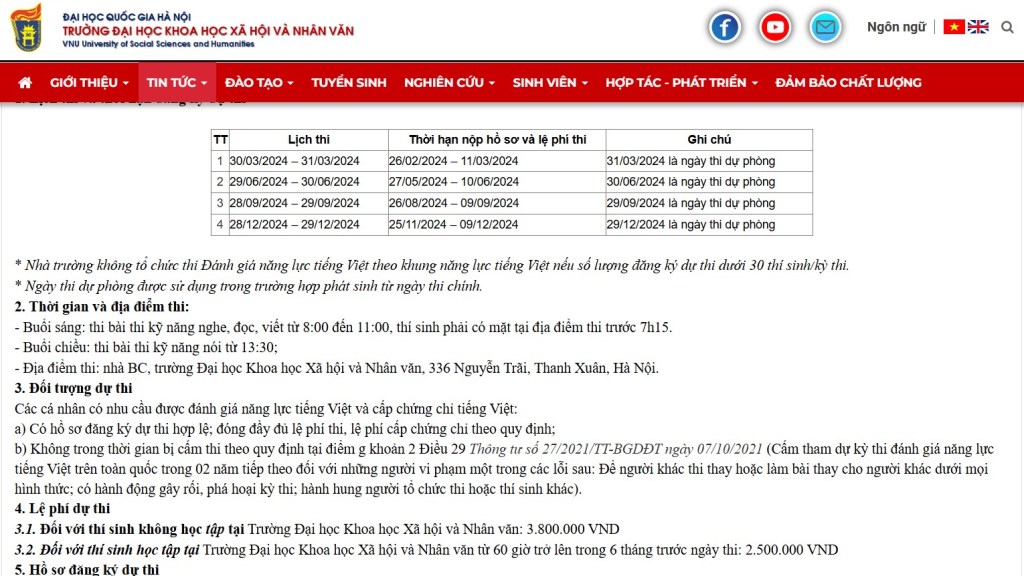 2024年時点で受験費用は3,800,000ドン(直近レートで約22,500円)で、直近6か月に60時間以上同校のベトナム語コースに通っている場合は2,500,000ドン(直近レートで約14,800円)で受験可能。