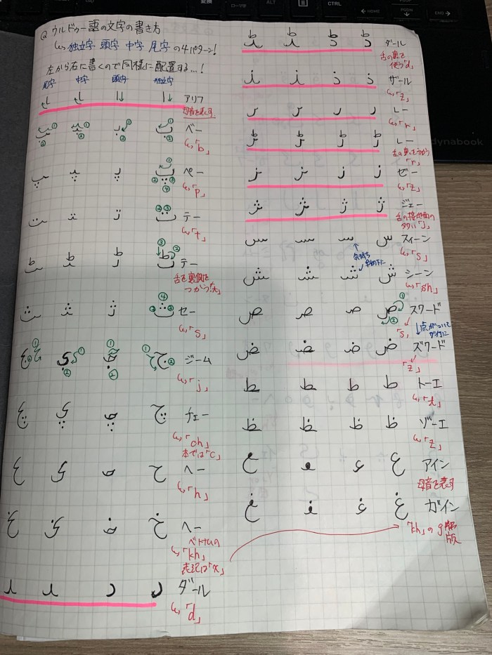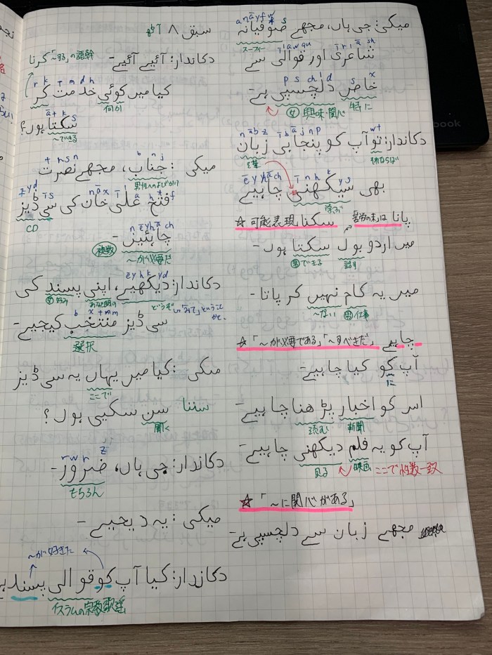 あとは、短い文やフレーズからで構わないので、ノートに自分で書き写し、読み上げてみましょう。カタカナに頼っているとなかなか定着しないので、別出ししてウルドゥー文字だけの状態で読むと良いです。