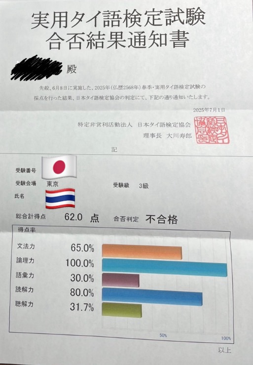 3年ぶりに再奮起して挑戦したタイ語検定3級でしたが、残念ながら不合格でした。意外といい線言ってたのはまぐれですね。正直言って本番の出来なさ具合で、勉強不足は明白でしたので、2点差とかでなくてよかったです。笑